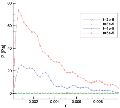Figure 11 depicts pressure on the surface of cross-section for different time steps. After the time step of , pressure on the surface is begun to increase by interaction of gas molecules. As it is expected, pressure values are not high, due to free molecular flow. Moreover, it shows that by marching from cylinder center to cylinder lips along the radius, the pressure value is decreased.