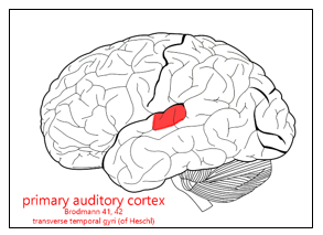 Figure 1 Primary auditory cortex; Brodmann areas 41 and 42 (under the eponym “Heschl's gyrus”/Transverse temporal gyrus). Available at: https://uen.pressbooks.pub/neuroanatomy/chapter/brodmann-areas/