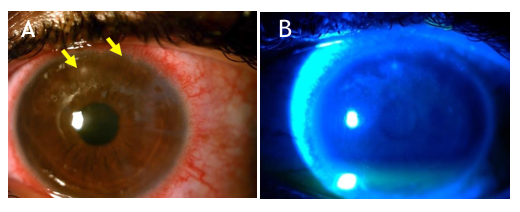 Figure 1A–B Clinical slit lamp images of the left cornea with a superior paracentral infiltrate (yellow arrow), with positive fluoresceine uptake, measuring 0.5x0.5 mm and an early semi- ring infiltrate associated with limbitis ( yellow arrow). The corneal epithelium had an unhealthy appearance.