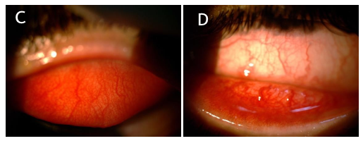 An eighteen-year-old male, equestrian rider, presented to the outpatient clinic with left severe eye pain, redness, tearing, photophobia and blurring of vision for 3 weeks. He is a myopic contact lens wearer, with poor contact lens hygiene. Before presenting to our cornea service, he was treated elsewhere for bacterial conjunctivitis with topical ciprofloxacin and steroid drops, which exacerbated his symptoms. He denied any recent traveling and close contact with unwell individuals. His initial distance visual acuity with correction was 6/6 for the right eye, and 6/24 left eye. Corneal sensation was intact. Slit-lamp examination of the right eye revealed blepharitis and scars of previous marginal keratitis. However, the left eye showed increased lacrimation and marked ciliary injection. The left cornea had a superior paracentral infiltrate, with positive fluoresceine uptake, measuring 0.5x0.5 mm and an early semi- ring infiltrate associated with limbitis. The corneal epithelium had an unhealthy appearance, upper and lower palpebral conjunctiva with hyperemia (Figures 1A–1D).