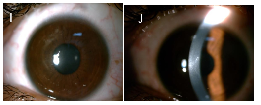 The patient demonstrated clinical improvement within 24 hours of initiating topical therapy, topical treatment regimen was continued for 2 weeks. Although the patient had no systemic signs or symptoms, he was treated prophylactically with 2g intravenous systemic ceftriaxone every day for 7 days as per the control strategy of invasive meningococcal disease within the United Arab Emirates2. The previously observed superior infiltrate had resolved, leaving behind a faint superior paracentral haze (Figures 1I–1J) while the corneal epithelial defect exhibited slow healing (Figure 1E). The conjunctival and ciliary injection subsided. His blood culture was negative for any growth.