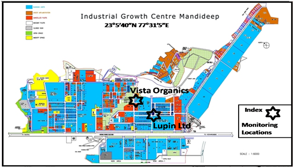 Vista Organics (P) Ltd, is one of the major producers of Pyrazinamide, an anti-TB drug in India. It also manufactures INH, another anti-TB drug, Niacin, Niacinamide, Vitamin and feed supplements, Erythromycin, the well known antibiotic and Zinc picolinate for exports. Its factory is located at Mandideep, Madhya Pradesh.14 These monitoring locations are shown in Figure 1