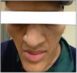 He was lost to follow up and presented to our outpatient clinic 18 years later complaining of frequent headaches with nose and hands enlargement. Further questioning revealed that he was also having significant debilitating lower back pain, decreased left sided vision and erectile dysfunction. These symptoms were impairing his daily activities and social life, to an extent that he would avoid any exposure to friends or family. Even though he did notice some changes to his face, they occurred gradually and only noticed them when they were very obvious.
