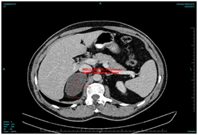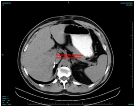A localized specific adrenal CT scan revealed a hypodense, clear delimited mass of the right adrenal gland, with dimensions of 8x4x6,6 cm, without contrast enhancement, measured of 11 Housefield units., mainly characterized by the radiologist as adenoma see Figure 1.