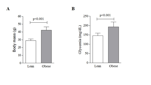 Mice receiving the HFD up to the 16th week were significantly heavier (42.3±4.3g; 45,8%) than mice that received the StD (29±1.9g; p<0.001; Figure 1A). They also presented significant hyperglycemia (192.3±27.3 mg/dL), when compared with StD mice (45.4±14.4 mg/dL; p<0.001; Figure 1B).