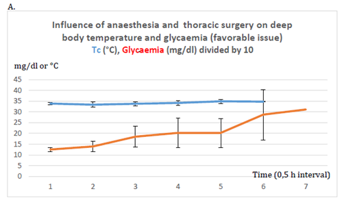 Taking into account the concomitant variations of glycaemia, Tc, Ts and dT, it was clear that when both temperatures, dT and glycaemia were falling, the vital prognosis was bad (lethal) - see Figure 3C, that confirms some literature data about negative effect of a too strong observance of glycaemic regimen.5,10,11 A marked tendency to normalization of these indices was practically a condition for anaesthesia and surgery favourable issue (Figure 3A,D,E & Figure 4A). Was it due to the end of anaesthetics effect or to adequate support of energetic balance as in Figure 3F in animal or Figure 5A. in clinics? that is still to be determined.
