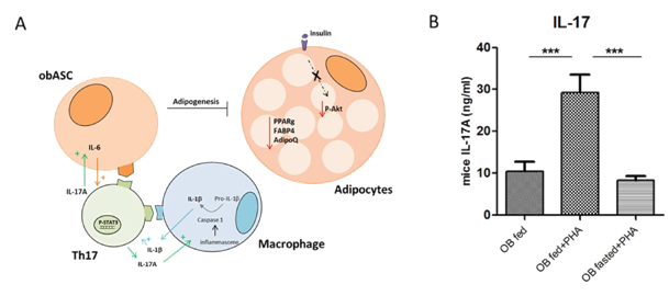 Figure 1 T helper cell (Th)17 activation in obese adipose tissue (AT) is reversed by short-term fasting. (A) Obese adipose stem cells (ASC) polarize AT-infiltrating CD4+ T cells towards IL-17A-secreting Th17 cells and increase IL-1b secretion by monocytes, which amplify IL-17A secretion. In turn, IL-6 secretion is increased in ASC, together with increased resistance to insulin, and inhibition of adipogenesis (from Eljaafari et al model). (B) ob/ob mice were fed or fasted overnight and IL-17A secretion was evaluated in stromal vascular fraction derived from visceral AT after phytohemagglutin (PHA) activation during 48 hours. Short-term fasting mice markedly suppressed pro-inflammatory IL-17A secretion.