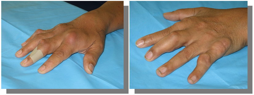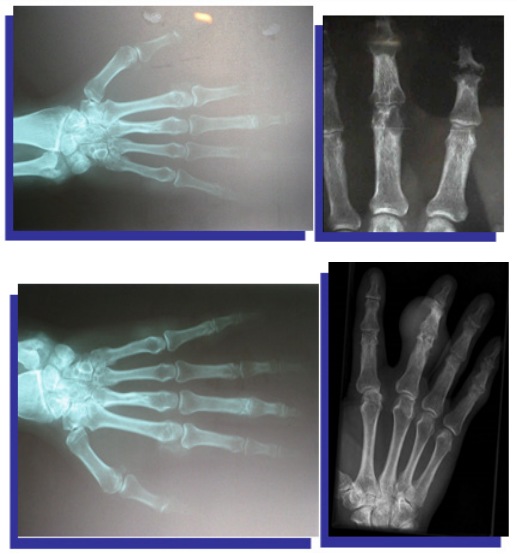 Figure 5 X-ray of both hands shows eccentric juxta-articular soft tissue nodule associated with adjacent bony erosion (rat-bite erosion) with sclerotic margins and overhanging edges invoking the proximal interphalangeal joint of middle finger with normal bone mineralization.