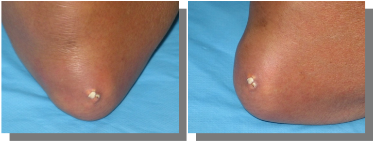 If the condition is left untreated, hyperuricemia persists, most patients develop more frequent acute attacks, less intense usually but may affect multiple joints at the same time or in rapid succession. Over time there will be subsequent deposition of MSU crystals in the joints, tendon sheaths, over bony prominences, and in subcutaneous tissues called tophi. Tophi are recognized as hard swellings whitish to yellow coloured under the skin, some may break and discharge chalky material containing MSU crystals. they have a predilection to common sites; the ear pinnae, olecranon or prepatellar bursae, the distal interphalangeal joints, the dorsum of the MTPJ, and metacarpophalangeal joint (MCPJ) (Figures 7–9).