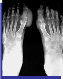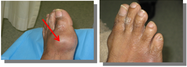 The initial and classical manifestation of gout is usually an acute attack in the majority of 90 % of patients, usually single or occasionally 2 joints and more might be affected and characterized by abrupt onset of severe pain and swelling, in more than 50% lower extremities small joints. Clinical scenario of the acute attack takes the crescendo pattern in 4-12 hours. The classical acute gout of 1st metatarsal phalangeal joint (Podagra) . the affected joint is erythematous and swollen with exquisitely tender, less frequently ankle joint might be affected. Podagra is not pathognomonic to acute gout another form of arthroses might take the same presentation. The joint inflammation usually takes 7-10 days and then subsides. In 10% of patients are presented initially by polyarticular arthritis that might mimic chronic arthroses, and occasionally creates difficulty in reaching the precise diagnosis. The attack might recur after a very variable period during this interval the joint looks normal, intermittent periods may extend months or even years, and few reported cases on flare at all! (Figure 6).
