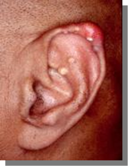 By the inflammation and collection of MSU crystals in form of tophi that might involve many tissues and occasionally the pinna of the ears, this kind of tophaceous gout is rarely observed nowadays, especially in our community (Middle East region). The patient who is presented here has exhibited acute attack on the top of chronic tophaceous gouty arthritis.