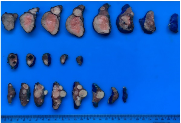 Right lymph node conglomerate: 54 lymph nodes, 26 show malignant neoplastic involvement. The largest metastasis corresponds to a 70mm conglomerate on the right, from group II. Left lymph node conglomerate: 65 nodes, 7 of them with neoplastic involvement, the largest of 18mm. TNM classification: T4aN1bMx.