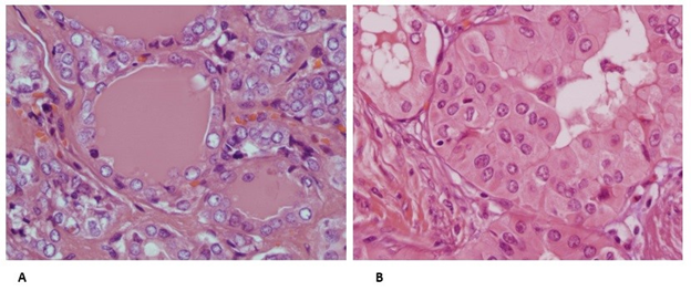 In the literature, the simultaneous appearance of different histological variants of thyroid cancer in the same patient has been reported, with different presentations, among the most common the concomitant appearance of MTC and PTC, PTC with dedifferentiation to anaplastic carcinoma (ATC), PTC with fasciitis-like stroma, and PTC with PTC, the latter being an unusual event that is rarely reported.2 In this article we present a clinical cases of patient with simultaneous appearance of different thyroid cancer subtypes (Figure 1).