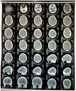 Patient was however noticed to have become aphasic, when he regained consciousness, and could not move his right upper and lower limbs. We managed as case of left hemispheric ischaemic stroke, the cranial CT (Figure 1) confirmed the diagnosis. The results of other investigations done are as follow: Packed cell volume was 31%, urine culture & sensitivity yielded no growth, electrolyte, urea and creatinine at admission and (the day after): Na 157.2 (146), Cl 107.6 (133.3), K 5.5 (4.77) and bicarbonate 17 (24), urea 22.6 (21.48), Creatinine 507.4 (160) and Malaria parasite (+++). In addition to controlling blood glucose with insulin, patient was also given IV Ceftriaxone for probable sepsis and IV Artesunate for malaria. Patient was co-managed by Paediatric endocrinologist, Paediatric neurologist and Physiotherapist, Nutritionist, and Paediatric nurses until patient was discharged home.
