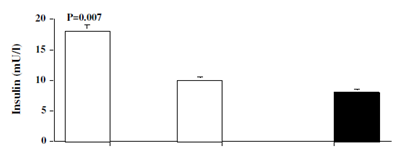 Pretreatment fasting glucose (p=0.01), insulin (p=0.007), intact proinsulin (p=0.02) were significantly higher in patients than controls. Patients tended to be more insulin insensitive compared with controls as shown by the calculated HOMA insulin resistance (p=0.07). After 6 months of antithyroid therapy with attainment of euthyroidism, concentrations of fasting glucose, insulin, intact proinsulin and HOMA insulin resistance decreased significantly in the patients and became similar to those of controls (Figure 2).