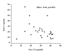 Within the patients, levels of ALS (Rho= -0.36, p=0.049) and IGF-1 (Rho= -0.66, p=0.001) demonstrated significant negative correlations with free T3. However, only IGF-1 concentration demonstrated a significant negative correlation with free T4 (Rho= -0.56, p=0.005). ALS and IGF-1 were not associated with TSH, nor with age, BMI, fasting glucose, insulin, intact proinsulin, or with IR (Figure 3).