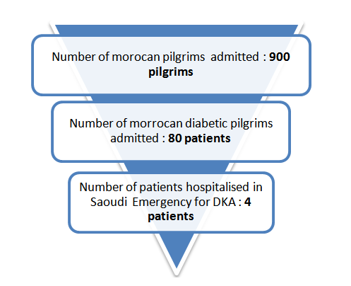 Literature search has shown that there are few and old data available on the status of diabetic pilgrims. To our knowledge, this is the first study performed on Moroccan pilgrims. It was conducted in the City of Al-Medina Al-Munawarah.