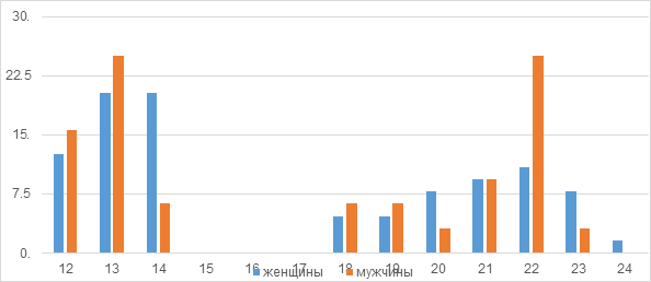 In the ERa gene, for example, short TA repeats overrepresented in transgender women are also associated with low bone mineral density in women as a result of decreased estrogen signaling, according to the literature. The distribution of alleles of this polymorphism was equally bimodal in both groups with two peaks of 13 and 22 repeats (Figure 1). The number of repeats ranged from 12 to 24. The number of women who are carriers of two short (12-14) TA repetitions (S/S) is 31.2%, whereas among men this indicator is 18.7% (Table 3) (Figure 1).