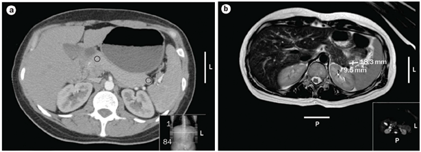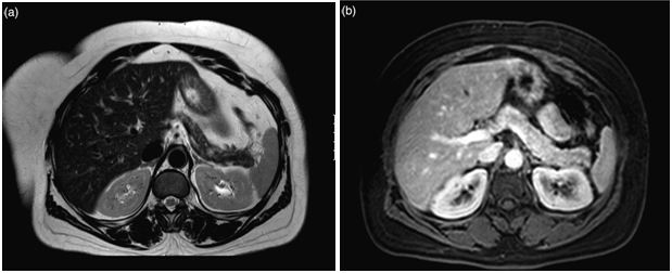 The latest studies have demonstrated that MRI is superior to other preoperative imaging techniques in identifying small pancreatic insulinoma. Its sensitivity ranges from 85% to 95%, in the detection of insulinoma and the determination of the presence of metastases. Using conventional sequences, small insulinoma usually have a low signal on T1-weighted sequences and a high signal on T2-weighted sequences. Some insulinomas containing fibrous tissue may show low signal intensity on both T1- and T2-weighted images. An improvement in MRI technique is the use of diffusion weighted MRI (DWI-MRI) for abdominal imaging. DWI is an MRI technique that detects changes in the molecular diffusion of water in biologic tissues and the valuable role of DWI in the detection of pancreatic tumors has been reported in several studies (Figure 4A), (Figure 4B) & (Figure 5).33–36