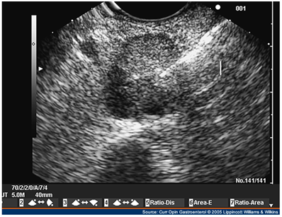 EUS allows the positioning of a high frequency (7.5-10 MHz) transducer in close proximity to the pancreas and lesions as small as 5 mm as well as tumors located in the bowel can be detected.