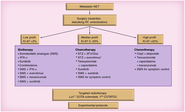 Single chemotherapeutic agents in midgut carcinoid tumors such as fluorouracil, dacarbazine, doxorubicin and streptozotocin were initially evaluated with little beneficial effect. As such, combination chemotherapy trials were conducted to try to improve on these results. However, there is no evidence that multi-agent regimens are any more effective; no regimen has demonstrated a response rate greater than 15% using the criterion of a 50% decrease in bi-dimensionally measurable disease. Combination of chemotherapy and IFN- therapy does not appear to improve on the results of monotherapy. However, in patients with pancreatic endocrine tumors, response rates of approximately 40% have been reported for streptozotocin in combination with other agents such as 5- fluorouracil, cisplatin or doxorubicin.Furthermore, temozolomide has demonstrated promising anti tumor effects in pancreatic NETs. A study combining temozolomide and thalidomide in 29 patients with metastatic carcinoid, pheochromocytoma or pancreatic NETs observed an objective biochemical (CgA) response rate of 40%, and a radiologic response rate of 25%; this was 45, 33 and 7% in patients with pancreatic NETs, pheochromocytomas and carcinoid tumors, respectively. The median duration of response was 13.5 months, 1-year survival was 79% and 2-year survival was 61%. The response rate seems to be related to the expression of 06-methylguanine DNA methyltransferase (MGMT). Low expression gives a higher response rate (40%) versus high expression (0%). A recent Phase II study in naive pancreatic neuroendocrine tumors treated with a combination of temozolomide plus capecitabine presented a PFS of 18 months and partial response (RECIST) in 67% of the patients.87–94