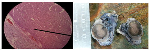 The levels of testosterone was 3.72ng/ml, the levels of FSH and LH were prepuberal.The chest x-ray and the abdominal - pelvic MRI were normal. Following referral to the Urology Team of the hospital, the patient underwent right radical inguinal orchidectomy and pathology examination of the right testis of 4x3x2.2cm revealed a well-circumscribed encapsulated solid nodule of 2.1.8x2cm, the cut surface was beige with yellowish central area and firm consistency (Figure 3). Immunohistochemically, vimentin and inhibin were expressed in the cytoplasm of the tumor´s cells, the KI67 were less than 1% compatible with tumor cells of Leydig (Figure 4).