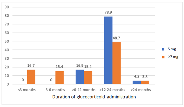 Table 1 summarizes the sociodemographic data of the studied patients. The age of the studied sample ranged from 15 to 86years old; with a mean age 49.1±15. Evaluation of the BMI revealed that 30.1% were obese; 24.6% were overweight; and 19.6% were extremely obese. The duration of prednisolone use was above 12 to 24months in most cases (72.3%). Patients were categorized into two groups according to the prednisolone dose (those administering ≥5mg daily for more than 3months and 7mg or more daily for more than 1 month). There was no significant difference in the age between the two groups (p=0.294). Also, there was no significant association between dose and gender (p=0.385) or BMI (p=0.065). A significantly higher frequency of patients on the >7mg dose administered prednisolone for either 3-6months (16.7%), or >24months (48.7%); while a significantly higher frequency of patients on the ≥5mg dose have taken treatment for >12-24months (78.9%) (Figure 2). Study of the patients diagnosed with osteoporosis showed that they had higher mean age (62.6±12.4 vs 45.5±14.3); while no significant association existed with gender (p=0.676), BMI (p=0.389), dose of prednisolone (p=0.289), or duration (p=0.227).