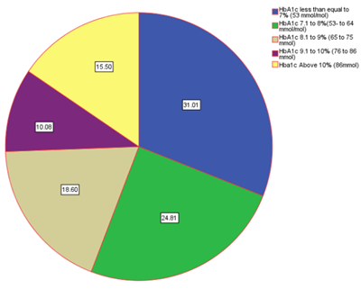 The mean and standard deviation for the last HbA1c value in diabetic study participants was 8.2±1.8% (range: 5.5-13.7). Diabetic females had a mean age of 61.0±10.5years, a mean BMI of 34.3±6.8 kg/m2, and a mean HbA1c of 7.8±1.6% while male patients had a mean age of 59.8±11.4 years, a mean BMI of 31.1±5.1 kg/m2, and a mean HbA1c of 8.6±2.0%. Among diabetics, 31.0% had a HbA1c value less than 7.00% (53 mmol/mol), 24.8% had HbA1c values between 7.01 to 8.00% (54-64 mmol), 18.6% of patients had a value between 8.01-9.00 % (65-75 mmol/mol), 10.1% had values between 9.01%-10.00% (75-86 mmol), and 15.5% of all people with diabetes had HbA1c values greater than 10.01% (86 mmol/mol) (Figure 3). Further analysis of the patients with diabetes revealed that the mean HbA1c for the insulin treated patients was 9.41% with the mean age of patients using insulin being 63.3 years.