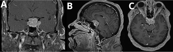 Figure 1 T1 post-contrast images in coronal (A), sagittal (B), and axial (C) views, demonstrating a sellar lesion with diffuse homogeneous enhancement pre-operatively.