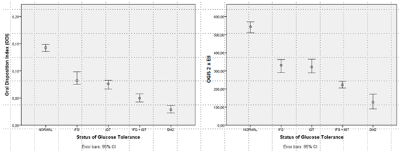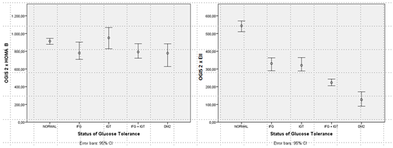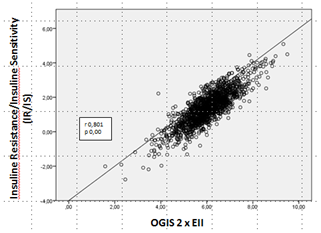 Furthermore Mirjam V et al..23 infer that subjects EII negative with insulin delta 0-30 negative indicating a low reserve of the beta cell and increased susceptibility to DM2.24-28 BMI was considered the most important confounding factor. The best correlation was found between IR/IS and EII x OGIS 2; r 0.809 (p 0.00). The highest correlation value obtained according to the status of tolerance was in the DM2 group IR/IS and EII x OGIS2 (r 0.997; p 0.00). The concordance between the known oral disposition index IR/IS and OGIS2 x EII was 0.557 (p 0.00).