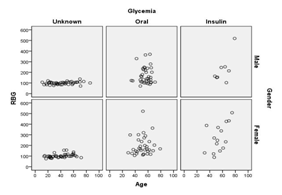 Now we bring in gender and Glycaemia into the picture. We have constructed tables for minimum, maximum, mean and standard devitation of the four vatiables like Table 2(A), corresponding to the six groups. Since no new conclusion could be drawn from these tables, we dropped these.