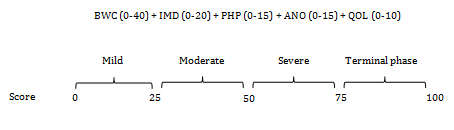 The cachexia score as already stated above, in addition to clear and objective diagnostic criteria, an essential requirement for both clinical trials and patient treatment is a staging system that allows for classification of the cancer patients according to the severity of the cachectic syndrome. Such a staging system would be beneficial not only for assessing the severity of the syndrome but also to decide the type of treatment. It was the aim of the present study to develop such a classification system. The result is the newborn CASCO which, by means of a numerical scale, classifies cachexia into mild (0-25), moderate (26-50), severe (51-75), and terminal (76-100). It is therefore clear that the higher the score, the worst the syndrome (Figure 2).28