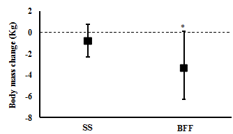 Figure 1 Body mass change with one week of SS and one week of BFF. Mean (95% CI, lower and upper bound), n= 7: * p < 0.05.