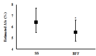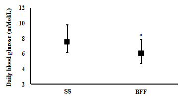 Changes in Blood profile: One week of BFF resulted in significantly lower average daily blood glucose levels (6.1 (4.7 to 7.9) mMol/L and (7.5 (6.1 to 9.8) mMol/L, respectively; t(6)= 3.4, p= 0.015; n= 7) (Figure 2), a significantly lower estimated A1c% (mean (CI): 5.5 (4.7 to 6.6) %) compared with SS (6.4 (5.5 to 7.7) %) (t(6)= 3.7, p= 0.010; n= 7) (Figure 3), and significantly lower daily peak in their blood glucose value (9.9 (8.3 to 12.7) mMol/L and 14.1 (9.0 to 21.5) mMol/L, respectively; t(6)= 2.5, p= 0.045; n= 7) (Figure 4).