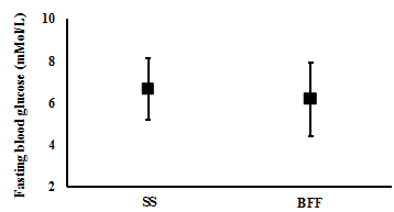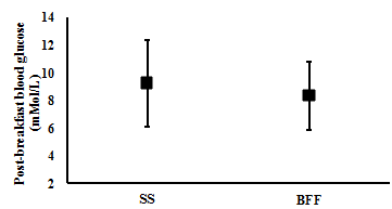There were no significant differences observed between one week of SS and one week of BFF in the participants blood glucose levels at fasting (mean (CI): 6.6 (5.2 to 8.1) mMol/L and 6.1 (4.4 to 7.9) mMol/L, respectively; t(4)= 1.2, p= 0.302; n= 5) (Figure 5), and postprandial breakfast (9.2 (6.1 to 12.3) mMol/L and 8.3 (5.8 to 10.8) mMol/L, respectively; t(4)= 1.5, p= 0.206; n= 5) (Figure 6). However, BFF resulted in significantly lower blood glucose levels compared with SS post-prandial lunch (7.2 (5.2 to 9.2) mMol/L and 9.3 (7.0 to 11.7) mMol/L, respectively; t(5)= 2.6, p= 0.048, n= 6) (Figure 7), and post-prandial dinner (7.0 (5.6 to 8.3) mMol/L and 9.6 (7.1 to 12.0) mMol/L, respectively; t(5)= 3.6, p= 0.015, n= 6) (Figure 8).