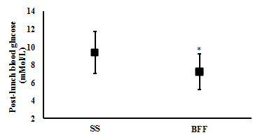 One week of BFF resulted in lower daily average, daily peak, post-prandial lunch and post-prandial dinner blood glucose levels. However, no difference in fasting and post-prandial breakfast blood glucose was observed between the two weeks.