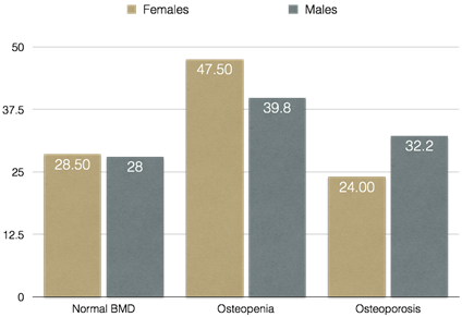 Our result showed highly significant prevalence of osteopenia and osteoporosis in males and females, irrespective of their age. A very interesting finding is that males were having more osteoporosis rates than females. Though many previous studies showed female osteoporosis predominance. Researchers have attributed this finding to their nutritional habits, long dressing, lack of weight bearing exercise and effect of menopause [9].