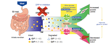 Dipeptidyl peptidase 4 (DDP4) is an enzyme responsible for glucagon like peptide-1 inactivation and plays an important role in glucose metabolism. DPP4 have demonstrated anti hyperglycemic efficacy of DPP4 inhibitors alone or in combination, with mean change in Hb1ac-3 to -19 mmol/mol (-0.3 to -1.7%) without excess risk of hypoglycemia or weight gain (Figure 2). 40–45
