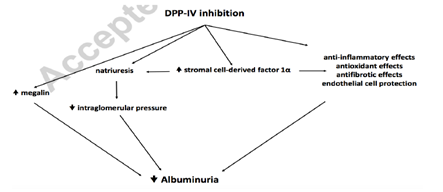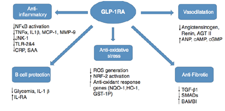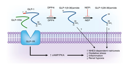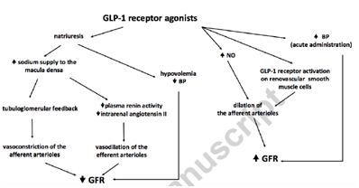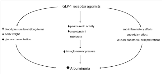 Additionally, studies in healthy humans have shown GLP-1 infusion to increase sodium excretion by kidneys. And in obese insulin resistant, GLP-1 infusion was associated with an increased sodium excretion, a decreased urinary secretion and a decreased GFR. Recent findings indicate that treatment with GLP-1 decelerates the progression of diabetic nephropathy by inhibiting inflammatory actions and by improving endothelial function (Figure 4).83–87