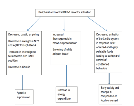 The peripheral and central GLP-1 receptor activation that is presented below has so far been proven with animal evidence only (Figure 7).