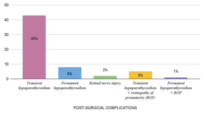 From a clinical perspective, the predominance of transient hypoparathyroidism over permanent hypoparathyroidism configures a predominantly reversible morbidity pattern, which has direct implications on the patient's quality of life and long-term care burden. This profile suggests that, although the rate of events is relevant, most correspond to complications of temporary resolution, which attenuates their overall clinical impact.
