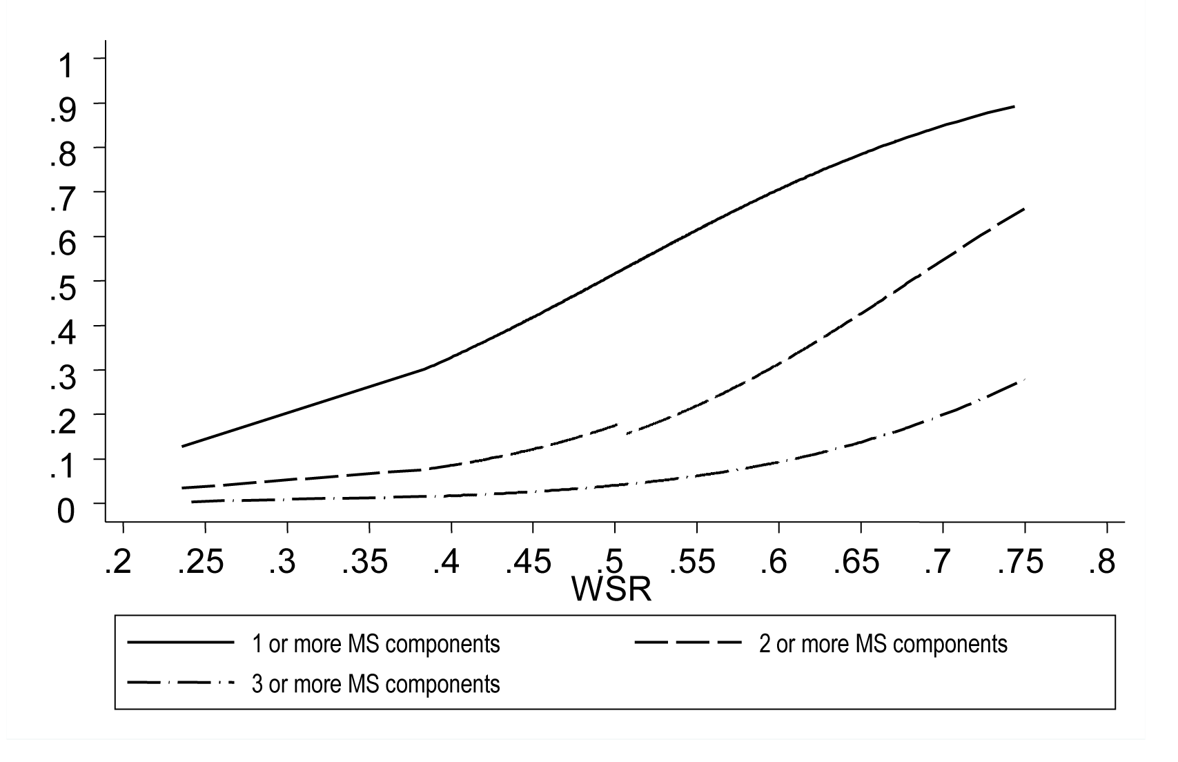 Because the current definition of MS does not fully quantify the full extent of cardiometabolic risk among children, the present study sought to examine whether increased WSR values are associated with the progressive accumulation of MS components and the strength of any such relationships. Therefore, we determined the proportional risk of aggregation of these components in relation to the increase in WSR among a pediatric population.