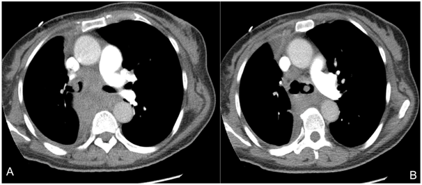 Figure 1 A, B. Chest CT-Scan showing bilateral endobronchial obstruction secondary to an infiltrative parahiliar right mass involving the carina and extending to bilateral main-bronchi.