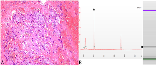 2. PCR product detected by high-resolution microcapillary electrophoresis with the DNA 1000 LabChip and the Agilent 2100 Bioanalyzer. The first and last peaks on electropherograms are marker peaks of 15 and 1500 bp, respectively; the microcapillary electrophoresis image is show on the right. Second peak (asterisks) shows the SRY gene amplification product and a single band on the microcapillary electrophoresis, confirming a gestational type of metastatic choriocarcinoma.