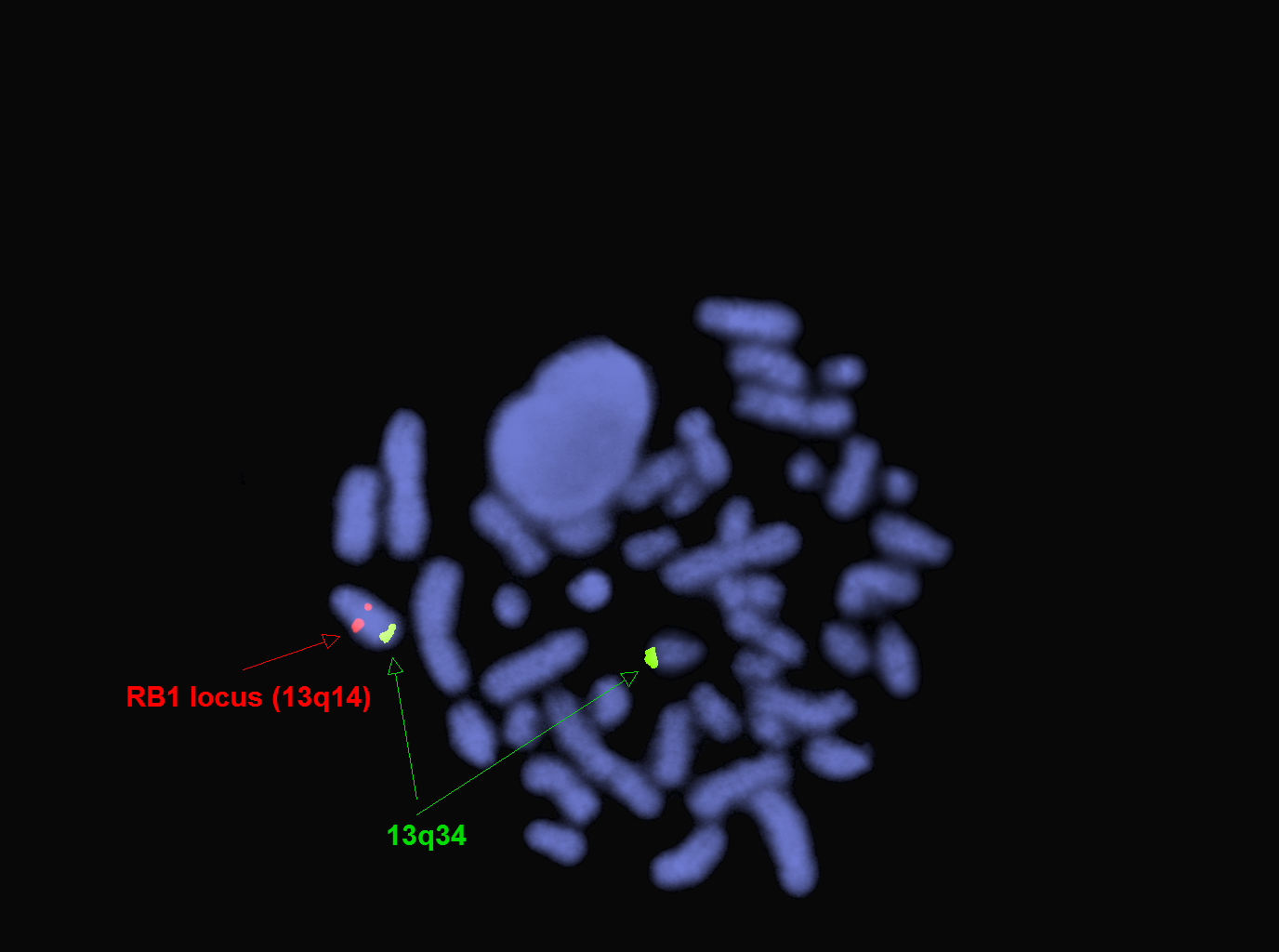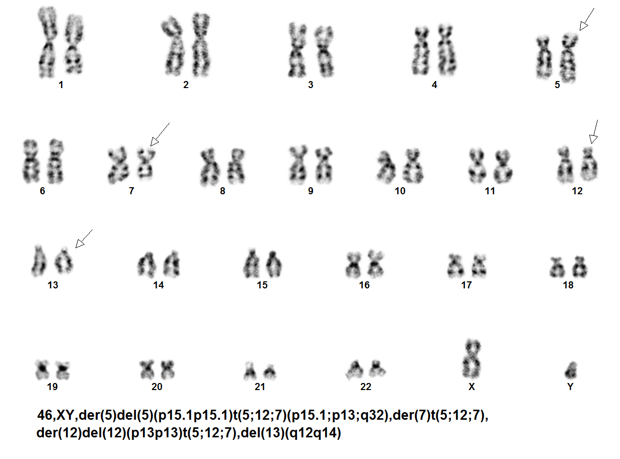 A two- year old male with a fatigue, bruising, petechiae and fever was presented for evaluation of normocytic anemia and thrombocytopenia in February, 2014. His initial bone marrow (BM) biopsy was hyper cellular, packed with a predominance of erythroids and a large percentage of immature forms. Flow cytometry was positive for CD33, CD7, CD36 and CD71, consistent with erythroid differentiation of immature cells. The diagnosis was FLT3-, NMP1- and KIT17 D816V negative AML. Cytogenetics revealed seventeen of the twenty cells analyzed revealed an abnormal karyotype and three cells were normal. Karyotype was highly complex with 46,XY,der(5)del(5)(p15.1p15.1)t(5;12;7), der(7)t(5;12;7), der(12)del(12)(p13p13)t(5;12;7), del(13)(q12q14)[17]/46,XY[3] with a simultaneous deletion of 5p15.1 and 12p13 regions of derivative chromosome 5 and derivative respectively, along with an interstitial deletion of chromosome 13 from q12q14 region involving the RB1 locus (Figure 1-3). The patient entered remission with induction chemotherapy, received consolidation chemotherapy, and at most recent follow up of about 18months after the initial diagnosis bone marrow studies were negative for leukemia by morphology and cytogenetic.