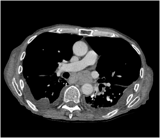 A 77 year old male nursing home resident presented a four week history of dyspnoea, non-productive cough, progressive dysphagia and generalised fatigue. He denied any appetite change or weight loss, fevers or night sweats, chest pain, haemoptysis or wheeze. He was a lifelong non-smoker, exposed to asbestos whilst working in a shoe factory. Clinical examination revealed decreased breath sounds and crackles in the left lower zone, but no peripheral lymphadenopathy or hepatosplenomegaly. Computerised tomography of the chest, abdomen and pelvis was carried out (Figure 1). Bilateral pleural effusions were seen, with left lower lobe consolidation. Meditational and right hilar lymphadenopathy compressing the oesophagus was noted and pleural calcifications suggested previous asbestos exposure.