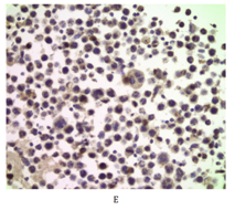 Cytological examination of the pleural effusion showed a malignant lymphomatous effusion. Numerous lymphoid cells were seen, with scant delicate cytoplasm and high nuclear: cytoplasmic ratio (Figure 2A). Nuclear abnormalities included irregular nuclear membranes (cleave and nuclear knobs) and coarse chromatin with prominent nucleoli. Mitotic activity was brisk with occasional abnormal mitotic figures. A lack of fibrin exudate and mixed inflammatory cells, together with the increased mitotic activity and nuclear abnormalities favoured a diagnosis of malignant lymphomatous effusion. A diffuse large B cell lymphoma was suspected and investigations were expanded. Immunophenotyping showed the cells to be positive for CD20, CD45, CD138, bcl-2, bcl-6, MUM-1 and MIB-1 (>90%) and negative for HHV8 (human herpes virus 8), EBV (Epstein-Barr virus), CD3, CD5 and CD10: this was confirmed by flow Cytometry (Figures 2B-2E). These findings were in keeping with the diagnosis of diffuse large B cell lymphoma.