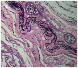 Ten percent neutral buffered formalin was used for fixation and 3 to 5 mm thick representative tissue biopsies were then processed in an automatic tissue processor using SLEE (mtp) processing machine. The blocks prepared by embedding the tissue in paraffin wax, then sectioned at 4μm using micro Tec laborgeräte microtome, and stained with hematoxylin and eosin (Figure 1) for light microscopy. Four sections (4μm in thickness) from each one of sixty biopsies were prepared for histochemical study after dewaxation as follows:
