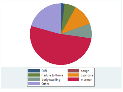 Two hundred and forty children were screened during the period and 158 (65.8%) of these children had abnormal echocardiolographical findings. More females than males were had abnormal echo findings at 51.9%. Mean age at diagnosis of congenital heart disease was 28 months (SD 33). Presence of a murmur at 41% was the most frequent indication for performing an Echo was followed by other symptoms like dysmorphism and cyanosis. (Figure 1) Acyanotic heart lesions were predominant at 55% while 25%vof all echo abnormalities were due to acquired heart diseases. Ventricular septal defects were the commonest acyanotic heart disease followed by PDA at 37% and 17% respectively. Tetralogy of Fallot was the commonest cyanotic heart disease at 8.23% followed by Truncus arteriosus at 5.9% (Table 1).