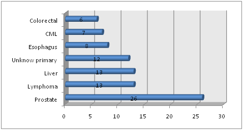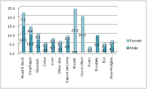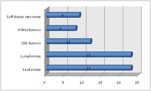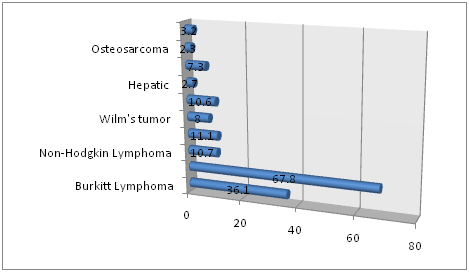 The National Cancer Institute, University of Gezira (NCI-UG), is a special center established in 1994 by the University of Gezira (UG) in Wad Medani, Sudan. UG is a community oriented University established in 1975, with a main objective of rural development. UG is located in the center of Sudan in Gezira state, the most densely populated state, which harbors the Blue Nile-irrigated Gezira Scheme. NCI-UG was established to meet the community’s needs in the fields of Oncology, Nuclear Medicine, Medical Imaging and Molecular Biology, integrating activities of research, service and training. The uniqueness of the approach of NCI-UG in implementing these complementary functions made the institute’s environment quite satisfactory in providing medical services, good quality research, and training programs.17 NCI-UG with the support of the International Agency for Research on Cancer (IARC), established in 2006 the Gezira Cancer Registry, the first population-based cancer registry in the country. The Gezira Cancer Registry, located at the NCI-UG in Wad Medani, the capital city of Gezira State, covers only Gezira State (Central Sudan, 26,075 km2), serving about four million people (10% of the total Sudanese population). Figures 6-8 detail the most common male, female and pediatric cancers in Central Sudan respectively.